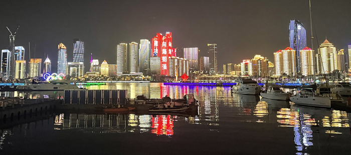 青岛浮山湾灯光秀为海大97周年校庆亮灯