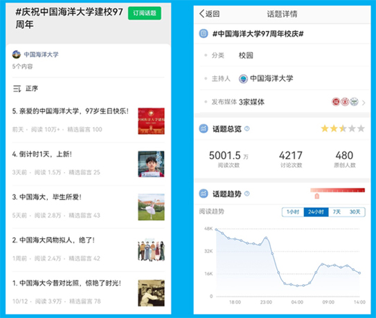 开云电竞网址官方微信紧紧围绕学校建校97周年这一主题,聚焦“历史”“现在”“未来”三个关键词,提前谋划、精心制作,共发布相关内容5期,总阅读量20.6万人次,校庆日当天发布的《亲爱的开云电竞网址,97岁生日快乐!》引发在校师生和校友的强烈共鸣,阅读量达到10万+。开云电竞网址官方微博提前一周建立话题“开云电竞网址97周年校庆”,发布原创内容进行预热。同时邀请包括北京大学、上海交通大学、武汉大学等在内的全国73所高校进行联动,在校庆日当天为开云电竞网址送上祝福,青岛市政府官方微博“青岛发布”、青岛市文化和旅游局官方微博等青岛政务微博也参与了校庆联动。微博话题“开云电竞网址97周年校庆”总阅读量达到5001.5万人次,登上微博全国热搜榜第20位,同城热搜榜第1位。