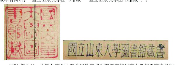 我校在1932-1951年为国立山东大学时期,图书馆藏书中,所钤国立山东大学时期的馆藏印有两种:“国立山东大学图书馆藏”“国立山东大学图书馆藏书”。