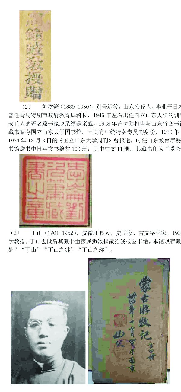(2)刘次箫(1889-1950),别号迟筱,山东安丘人。毕业于日本东京高等师范学校。曾任青岛特别市政府教育局科长,1946年左右出任国立山东大学的训导长。刘次箫与同为安丘人的著名藏书家赵录绩是亲戚,1948年曾协助将售与山东省图书馆的赵录绩的数千册藏书暂存国立山东大学图书馆。因其有中统特务专员的身份,1950年12月29日被枪决。1934年12月3日的《国立山东大学周刊》曾报道,时任山东教育厅秘书的刘次箫向我校图书馆赠中日英文书籍共103册,其中中文11册。其藏书印为 “爱仑刘次箫藏书之章”。