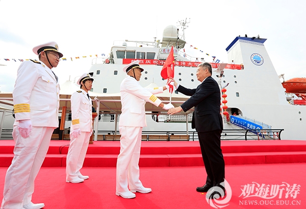 校长于志刚(右一)为“东方红3”船授旗