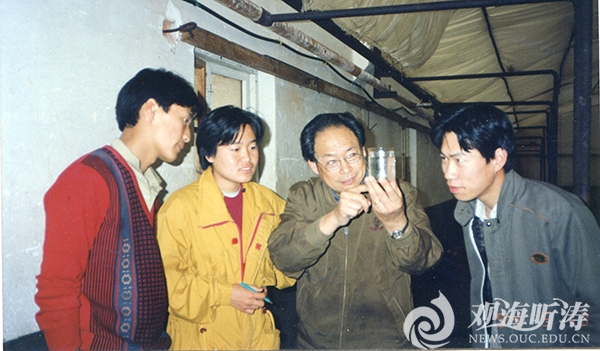 1994年,青岛海洋大学水产学院教授王克行(右二)在指导学生检查虾苗及对虾幼体发育情况。