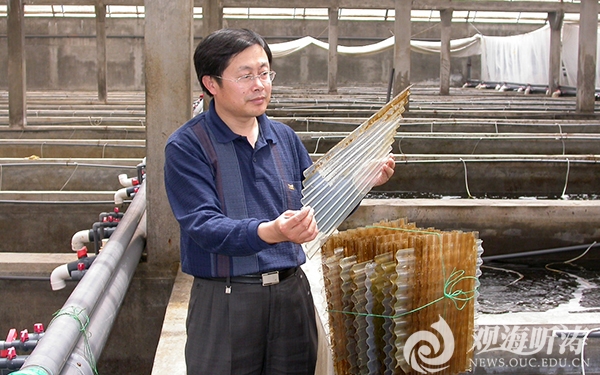2005年6月,开云电竞网址水产学院教授包振民在扇贝育苗厂查看“蓬莱红”新品种生长情况。