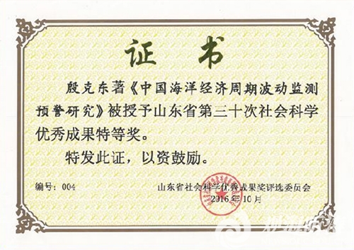 2016年10月,《中国海洋经济周期波动监测预警研究》获得山东省第三十次社会科学优秀成果特等奖。