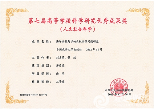 2015年12月10日,《海洋法视角下的北极法律问题研究》获得教育部第七届高等学校科学研究优秀成果奖(人文社会科学)三等奖。