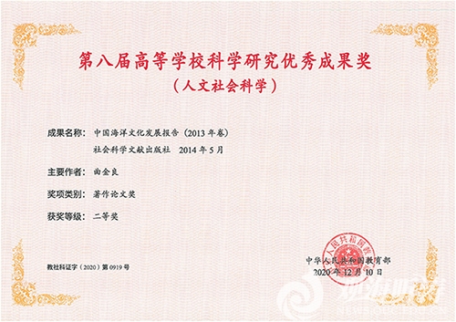 2020年12月10日,《中国海洋文化发展报告》(2013年卷)获得第八届高等学校科学研究优秀成果奖(人文社会科学)二等奖。