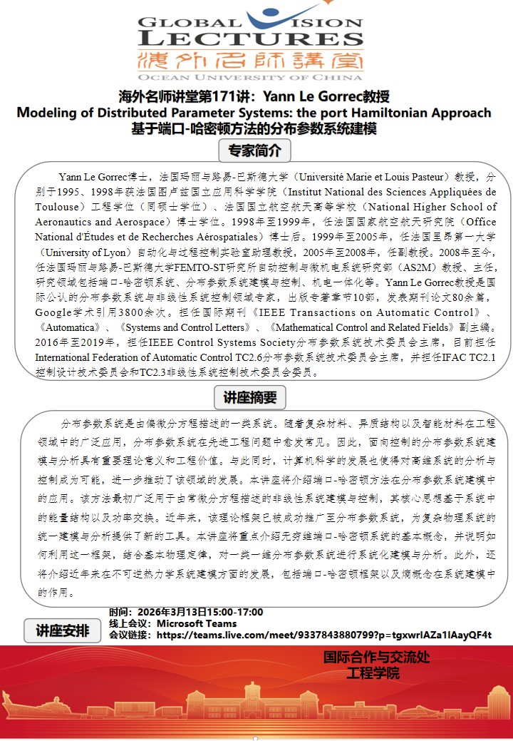 海外名师讲堂第一百七十一讲-Yann Le Gorrec教授:Modeling of Distributed Parameter Systems:the port Hamiltonian Approach 基于端口-哈密顿方法的分布参数系统建模