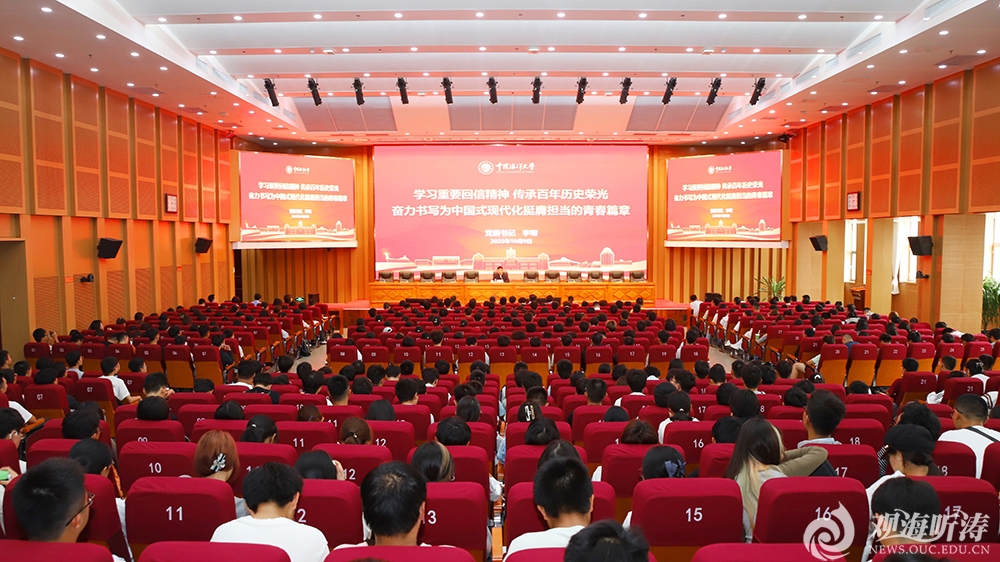 • 本站讯10月9日,学校党委书记李明以“学习重要回信精神,传承百年历史荣光,奋力书写为强国建设挺膺担当的青春篇章”为题,为2025级4800余名本科新生讲授 “开学第一课”。授课采用线上和线下相结合的方式举行。李明聚焦“追寻”这一主题,从“追寻之海大”“追寻之时代”“追寻之青春”三个维度,与同学们进行了深入交流,鼓励广大学生以强大的内驱动力开启大学生活崭新篇章,在海大园中幸福成长、全面发展。围绕“追寻之海大”,李明通过“应国需·涵海立志”“报国行·浩海求索”“兴国力·树人立新”和“强国梦·勇立潮头”四个历史阶段,全面总结回顾了世纪海大的奋斗历程。他强调,学校始终与伟大祖国同呼吸、与海洋事业共命运、与齐鲁发展相交融,为国家教育事业和海洋事业发展作出了不可替代的历史性贡献。围绕“追寻之时代”,李明带领同学们重温习近平总书记在学校建校100周年之际给全体师生的重要回信。他讲到,学校正以习近平总书记重要回信和重要讲话精神为根本遵循,立足“两个大局”,推进实施“5135”发展战略,坚持立德树人根本任务,实施蓝色梦想宏才培育计划,聚力完善人才培养模式、构建特色“大思政”育人体系、实施一流本科教育行动