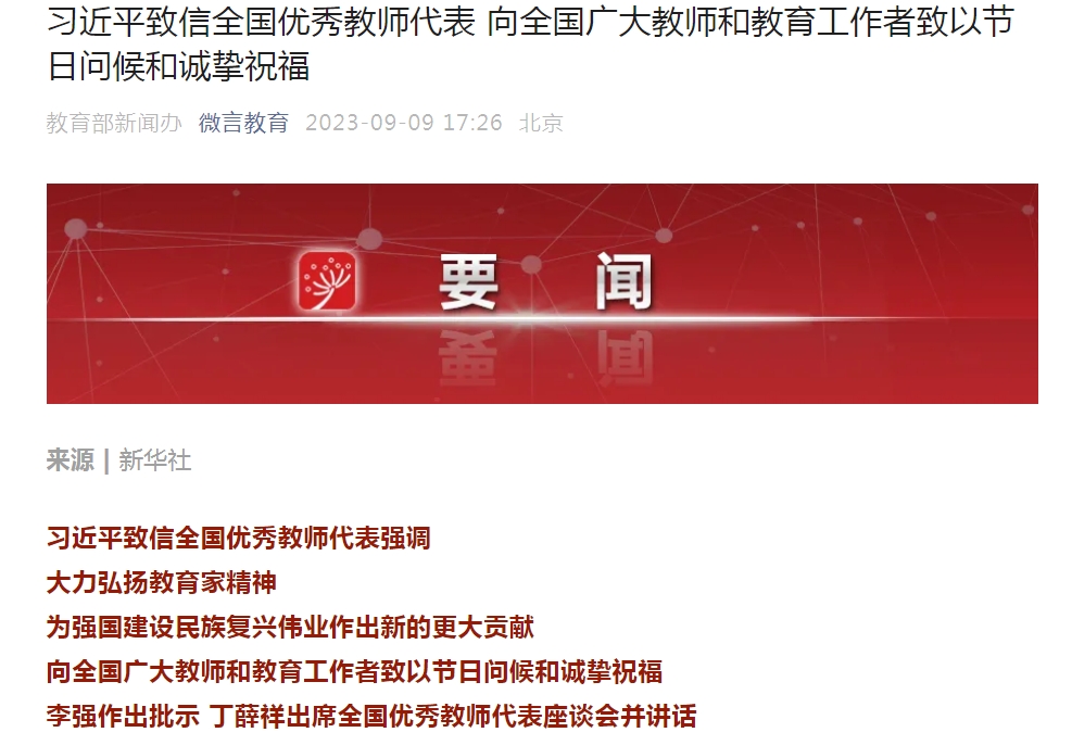 习近平致信全国优秀教师代表 向全国广大教师和教育工作者致以节日问候和诚挚祝福