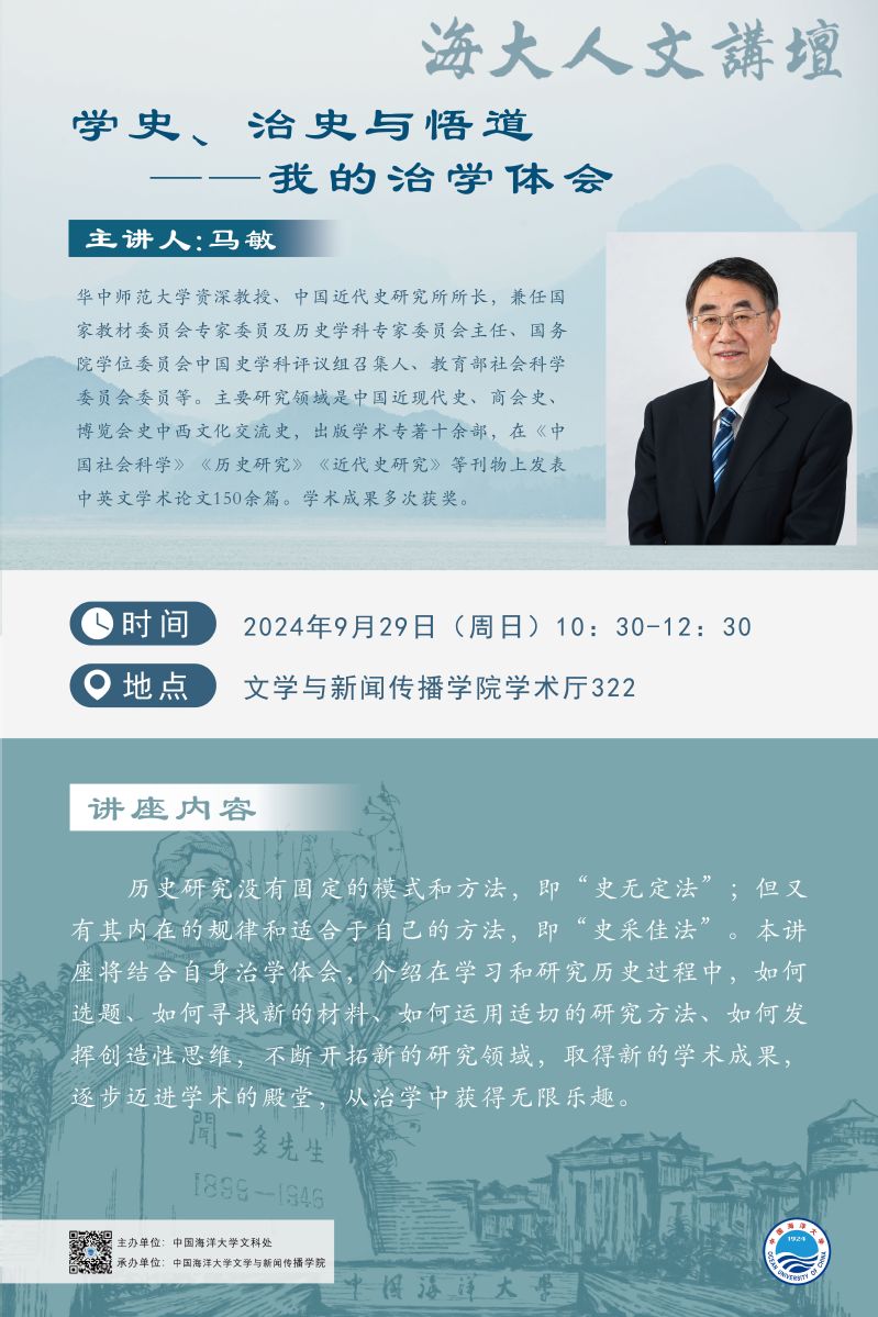 海大人文讲坛2024年第70讲-马敏:学史、治史与悟道——我的治学体会