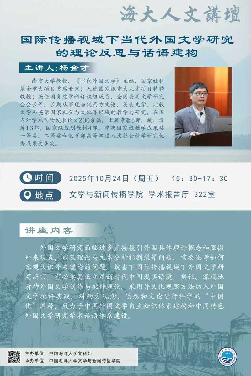 海大人文讲坛2025年第74讲-杨金才:国际传播视域下当代外国文学研究的理论反思与话语建构