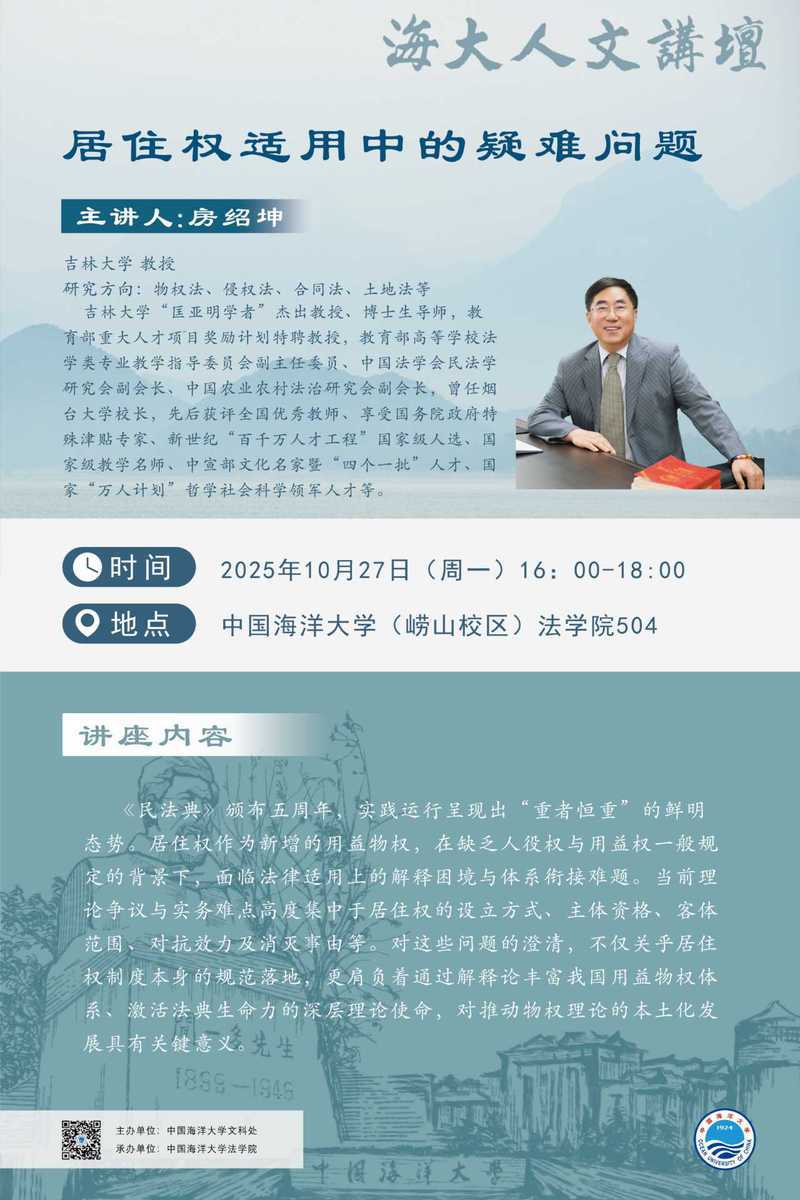 海大人文讲坛2025年第79讲-房绍坤:居住权适用中的疑难问题