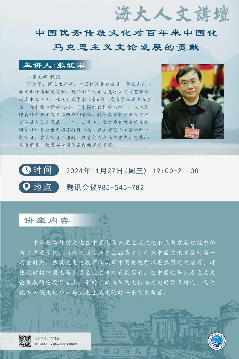 海大人文讲坛2024年第93讲-张红军:中国优秀传统文化对百年来中国化马克思主义文论发展的贡献