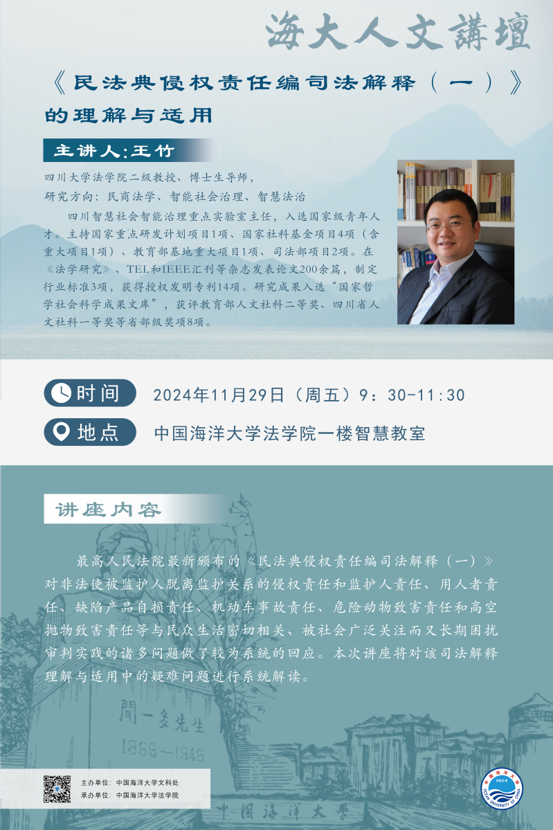 海大人文讲坛2024年第95讲-王竹:《民法典侵权责任编司法解释(一)》的理解与适用