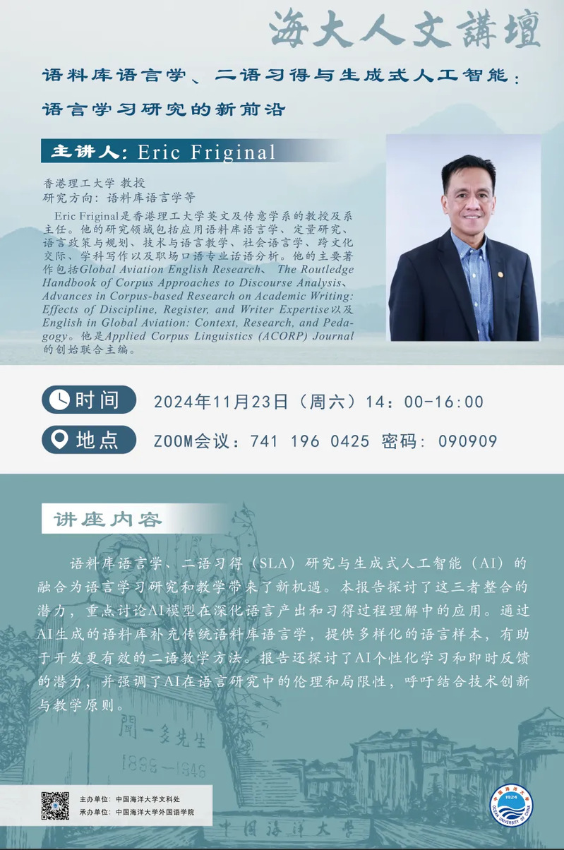 海大人文讲坛2024年第91讲-Eric Friginal:语料库语言学、二语习得与生成式人工智能:语言学习研究的新前沿