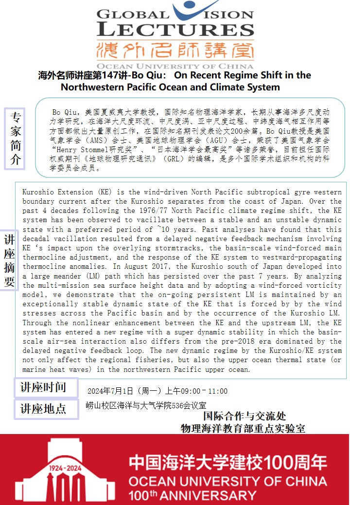 海外名师讲座第一百四十七讲-Bo Qiu:On Recent Regime Shift in the Northwestern Pacific Ocean and Climate System