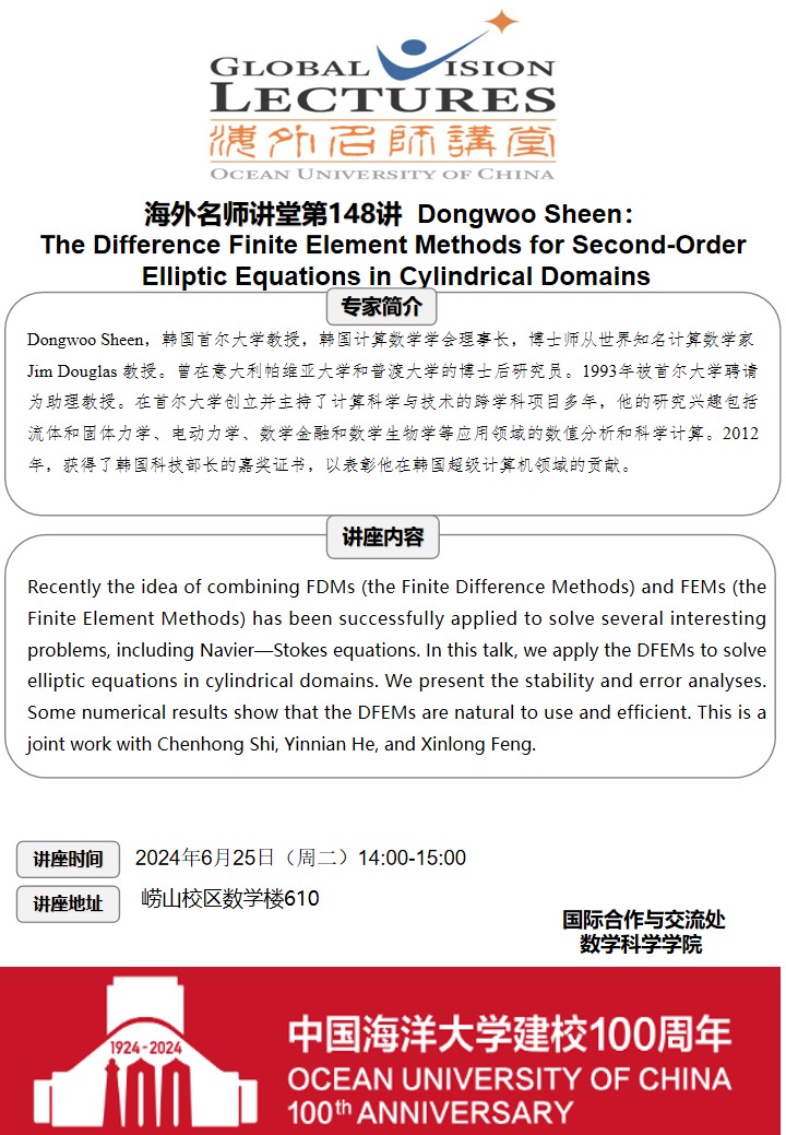 海外名师讲堂第一百四十八讲-Dongwoo Sheen:The Difference Finite Element Methods for Second-Order Elliptic Equations in Cylindrical Domains