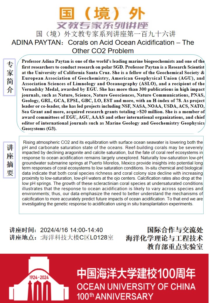 国(境)外文教专家系列讲座第一百九十六讲-ADINA PAYTAN:Corals on Acid Ocean Acidification – The Other CO2 Problem