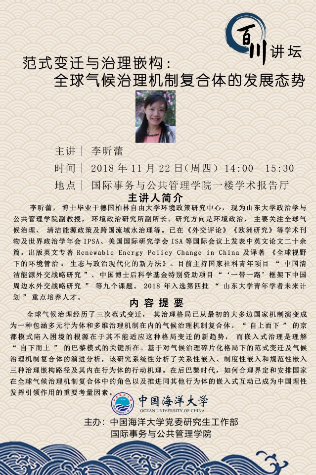 研究生百川讲坛-李昕蕾:范式变迁与治理嵌构:全球气候治理机制复合体的发展态势