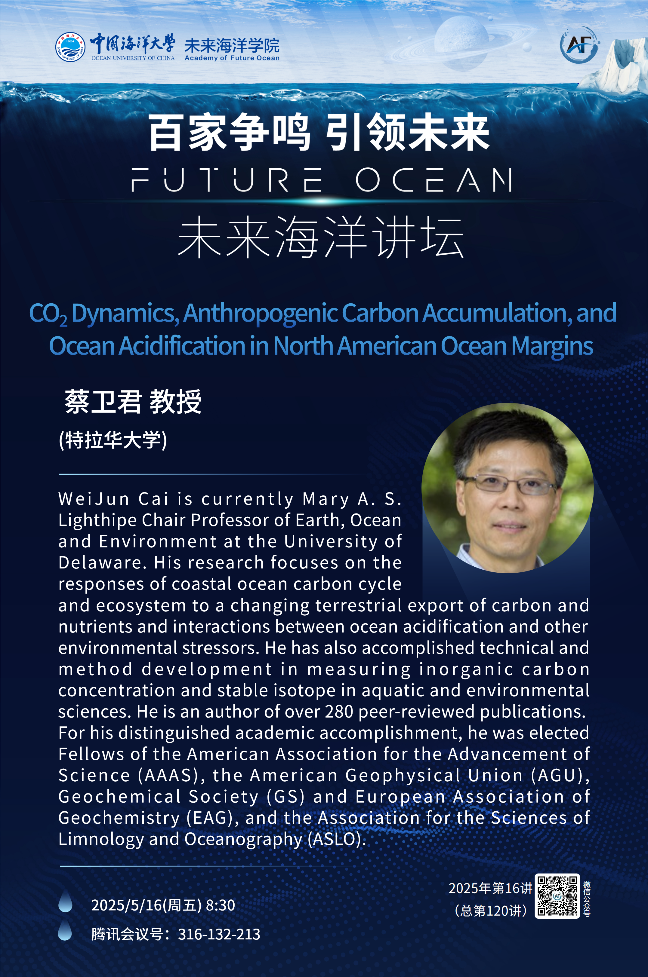 未来海洋讲坛第120讲(2025年第16讲) -蔡卫君:CO2 Dynamics, Anthropogenic Carbon Accumulation, and Ocean Acidification in North American Ocean Margins