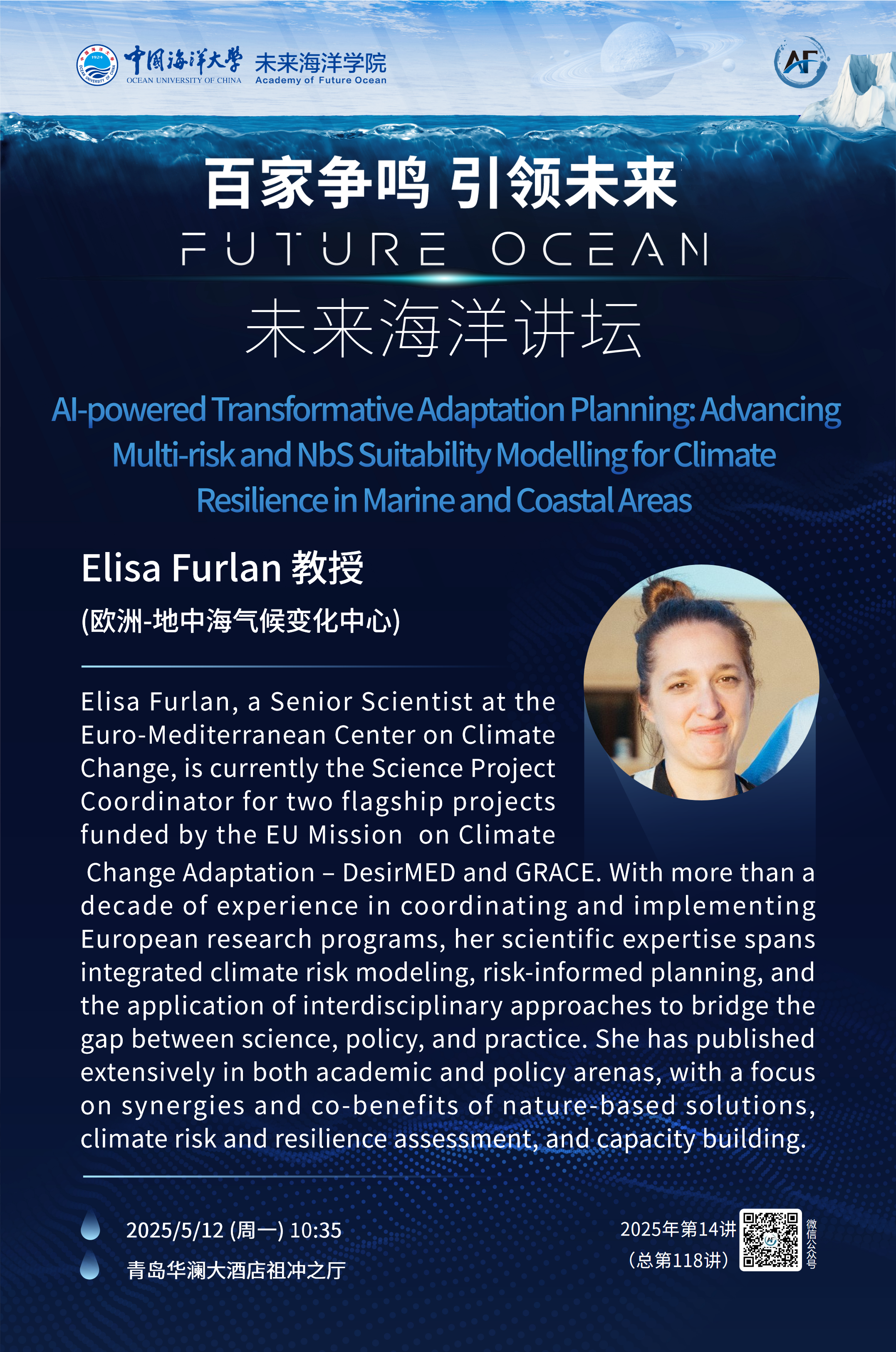 未来海洋讲坛第118讲(2025年第14讲) -Elisa Furlan:Al-poweredTransformative Adaptation Planning: Advancing Multi-risk and NbS Suitability Modelling for Climate Resilience in Marine and Coastal Areas