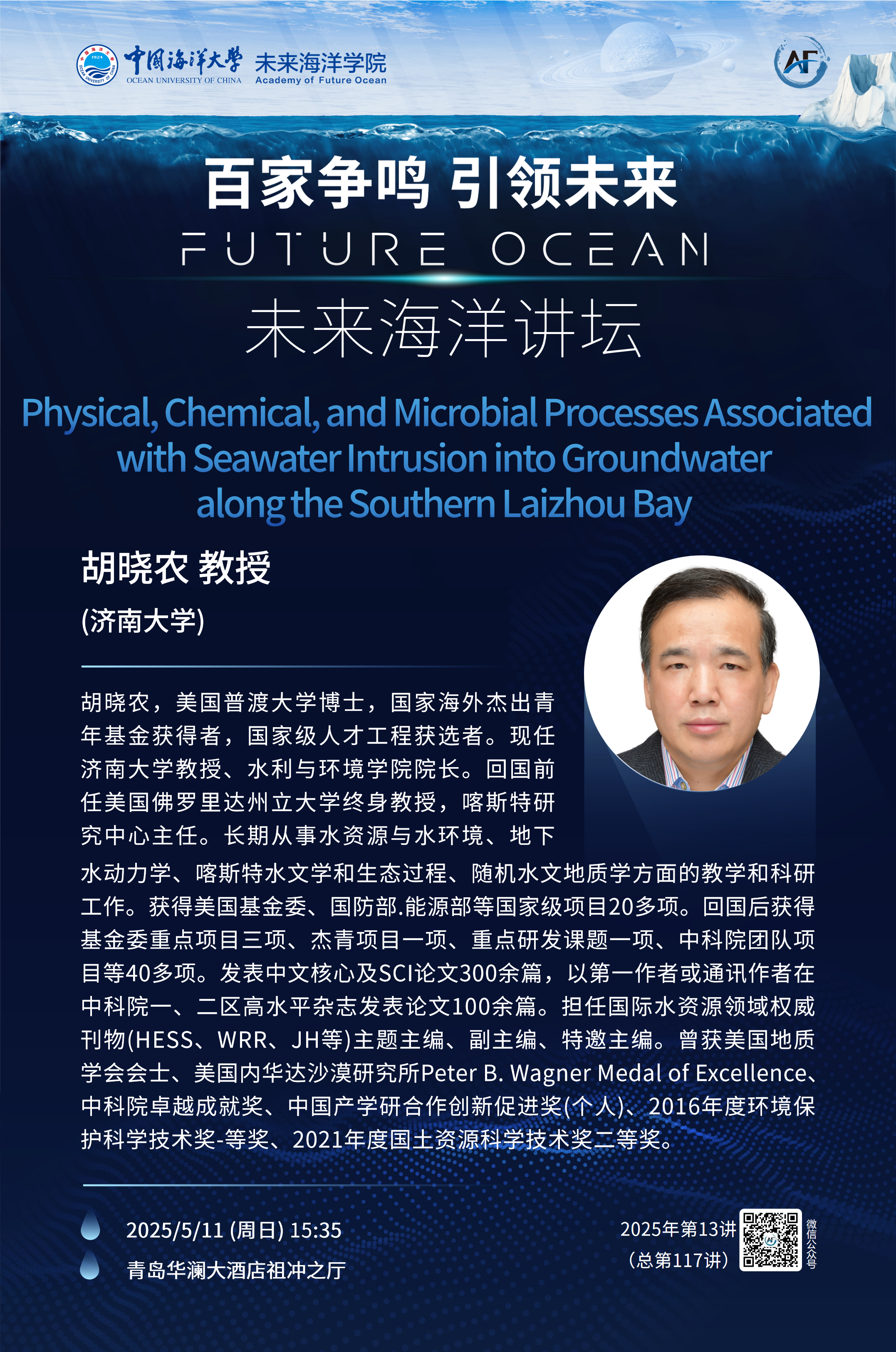 未来海洋讲坛第117讲(2025年第13讲) -胡晓农:Physical, Chemical, and Microbial Processes Associated with Seawater Intrusion into Groundwater along the Southern Laizhou Bay