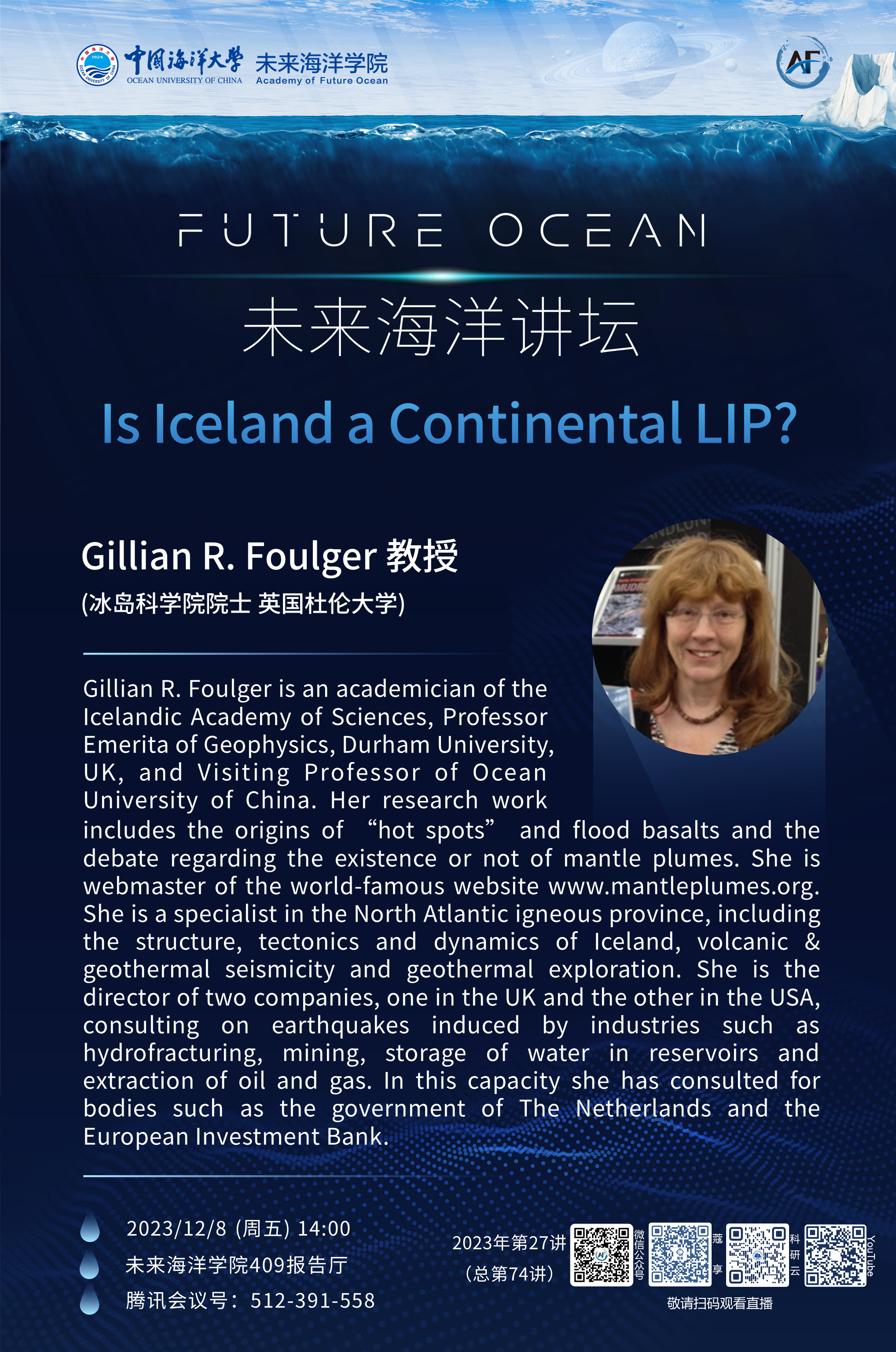 未来海洋讲坛第74讲(2023年第27讲)-Gillian R. Foulger:Is Iceland a Continental LIP?