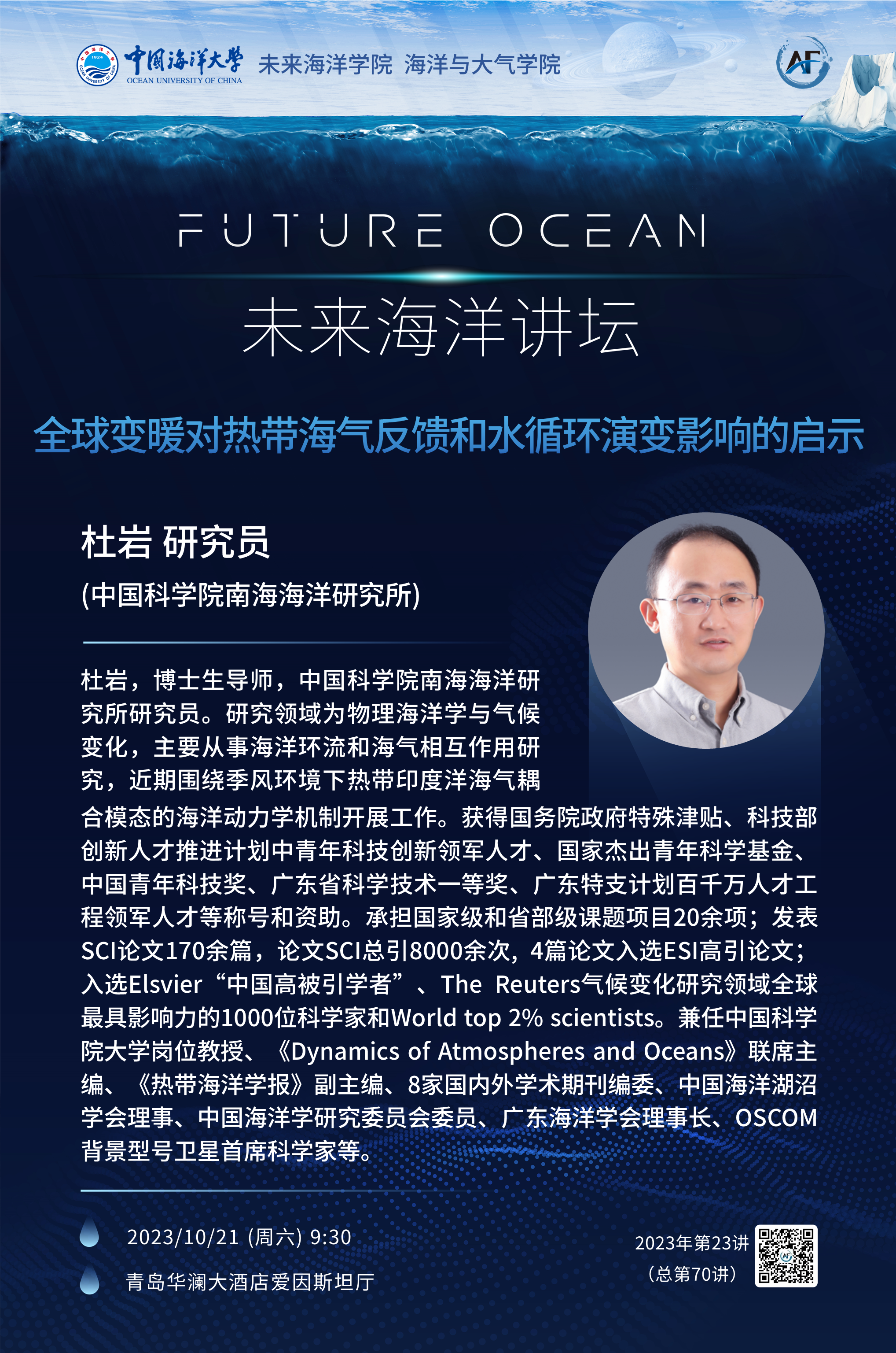 未来海洋讲坛第70讲(2023年第23讲)-杜岩: 全球变暖对热带海气反馈和水循环演变影响的启示