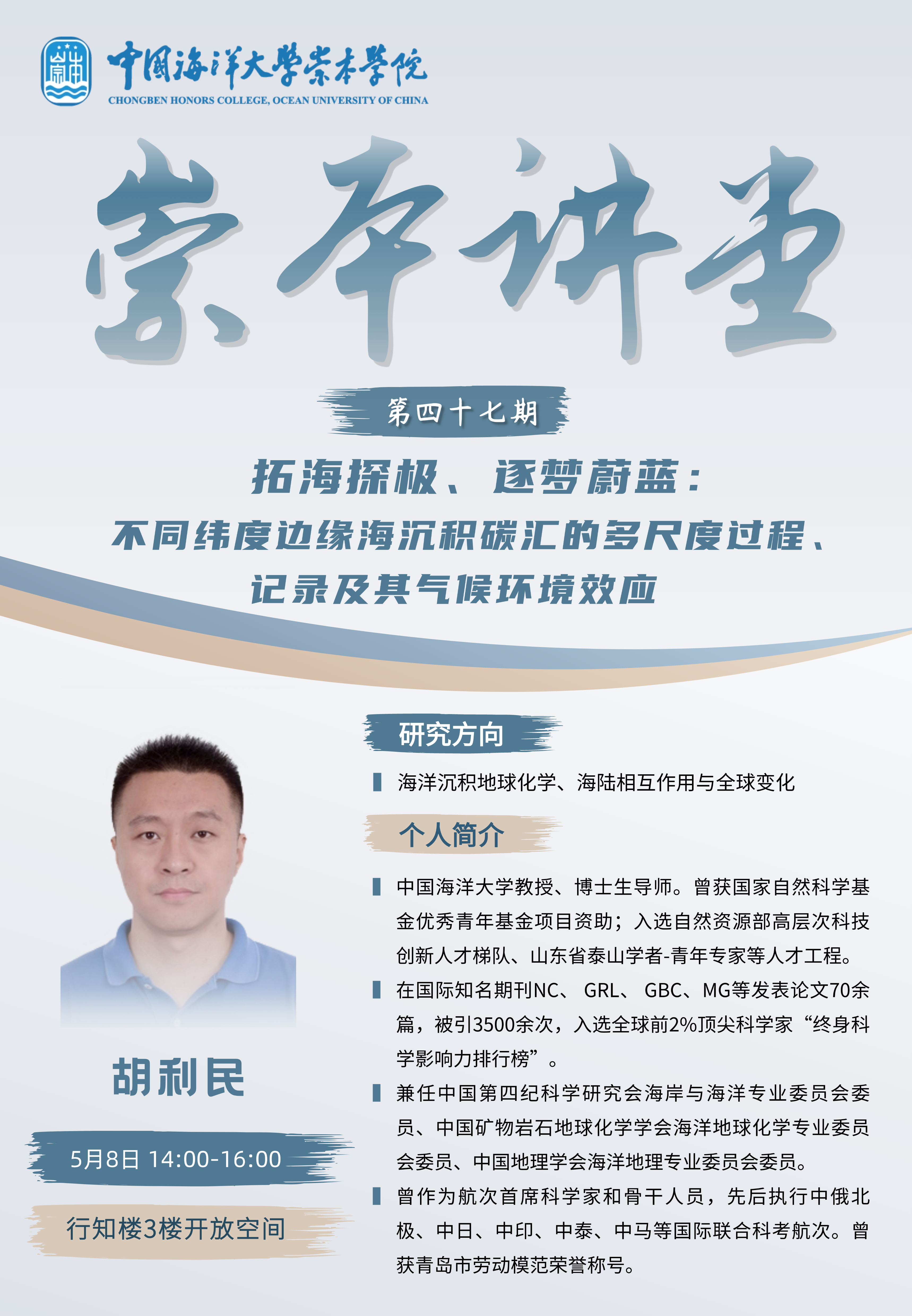 崇本讲堂第四十七讲-胡利民:拓海探极、逐梦蔚蓝:不同纬度边缘海沉积碳汇的多尺度过程、记录及其气候环境效应