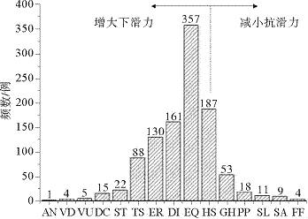 Urgeles和Camerlenghi对地中海的海底滑坡进行统计分析,总结出15种相关因素(图6):火山发展(VD)、地震(EQ)、构造削峭(TS)、削峭作用(ST)、侵蚀(ER)、差异压实(DC)、底辟(DI)、火山隆升(VU)、人类活动(AN)、高沉积速率(HS)、流体流动(FF)、孔隙压力(PP)、气体水合物(GH)、气体(GA)、海平面(SL)。其数据局限于地中海区域,故统计结果与Hance(2003)存在一定差异,但两者都显示地震与沉积物的快速沉积等是海底滑坡的主要触发因素。