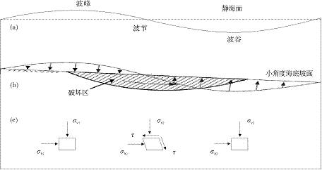式中:P0为压力振幅,λ为波数,ω为角频率,t为时间,γω为海水重度,H为波高,d为水深。如图7c所示,平面应变状态分析中,波浪作用下波峰和波谷对应的土体单元仅受附加正应力,波峰波谷之间对应的土体单元受附加正应力和剪应力,波节对应的土体单元具有最大剪应力。波行进过程中,附加应力不断变化,将其视作循环荷载。循环正应力与剪应力共同作用,导致塑性变形;孔隙水未及排出,导致孔压累积。最终造成土体发生液化、剪切和顺坡运移。风暴浪甚至可以搬运200t的巨石,其影响程度受纬度影响,且起作用的最大水深一般不超过150~300m。