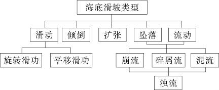 林振宏等、杨作升等认为海底斜坡不稳定性的类型主要分海底坍塌、海底滑坡、流动三种。海底坍塌只限于局部的近于直立斜坡地区的岩石、泥和砂粒自由地塌落;海底滑坡是岩石和松软沉积物的滑动,是海底斜坡破坏的最普遍类型,包括瓶颈状滑坡、浅层板状滑坡(又称平移滑坡)、浅层旋转滑坡;流动进一步分为碎屑流、液化流、颗粒流、浊流四种。其中瓶颈状滑坡为最小型的海底滑坡类型,浅层板状滑坡为最常见的海底滑坡类型。
