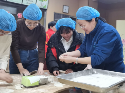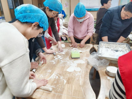 (志愿者与牟家社区老年食堂工作人员一起包饺子)