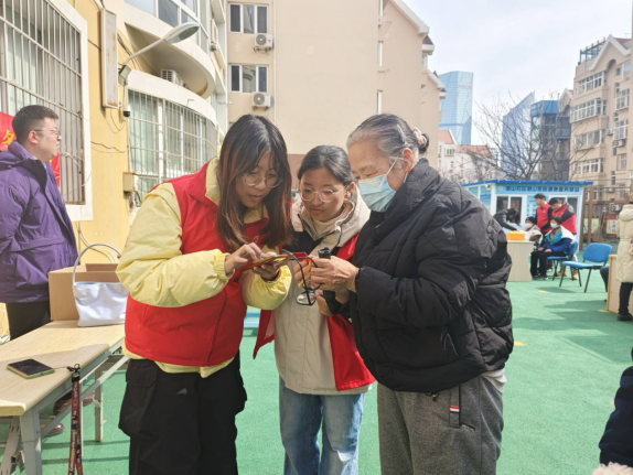 3月4日,“小政”志愿服务队联合青岛市无障碍环境促进会赴湛山社区开展“雷锋精神照人间,志愿行动暖万家”志愿服务活动,志愿者为湛山社区中老年人讲解智能手机使用、科普金融反诈知识。
