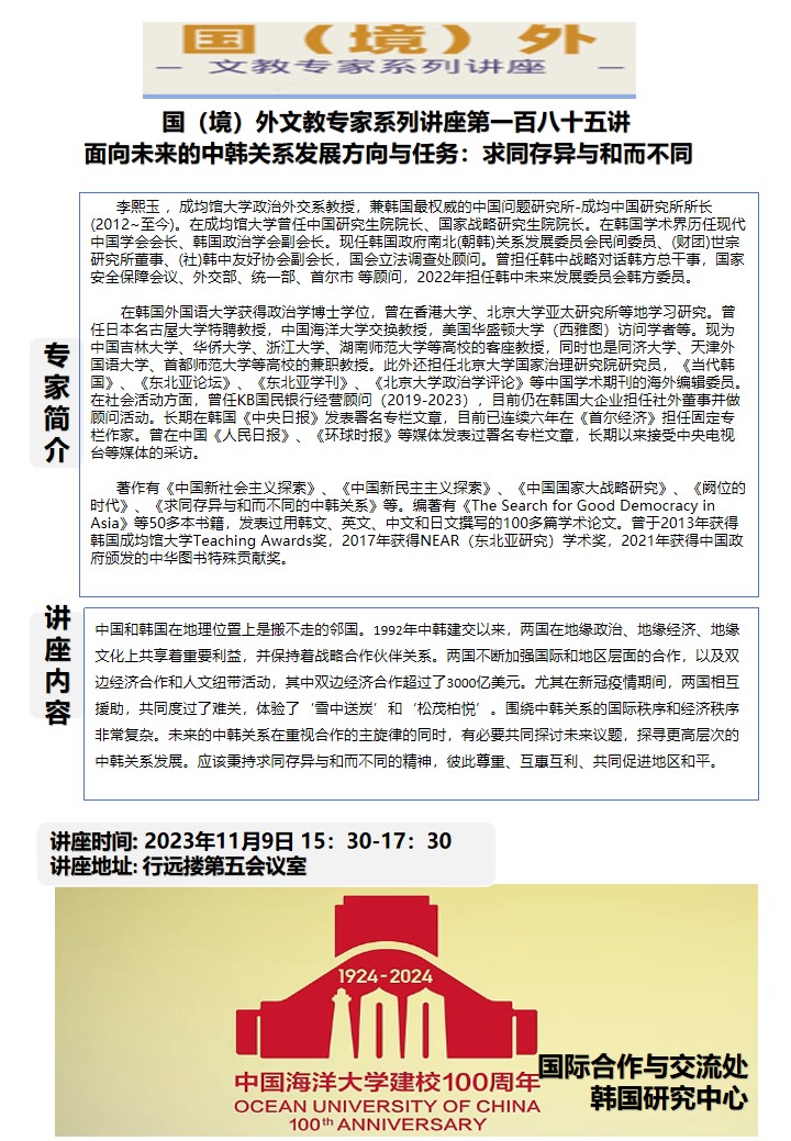 国(境)外文教专家系列讲座第一百八十五讲-李熙玉:面向未来的中韩关系发展方向与任务:求同存异与和而不同