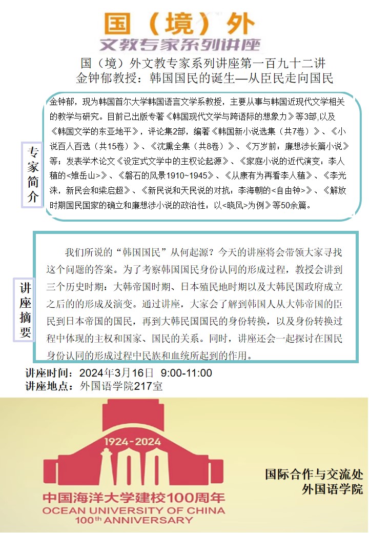 国(境)外文教专家系列讲座第一百九十二讲-金钟郁:韩国国民的诞生—从臣民走向国民