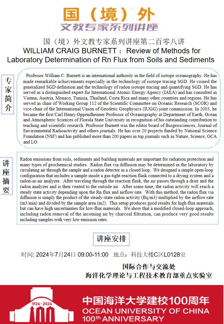 国(境)外文教专家系列讲座第二百零八讲-WILLIAM CRAIG BURNETT:Review of Methods for Laboratory Determination of Rn Flux from Soils and Sediments