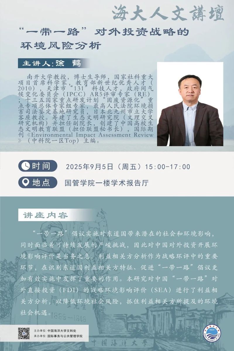海大人文讲坛2025年第60讲-徐鹤:“一带一路”对外投资战略的环境风险分析