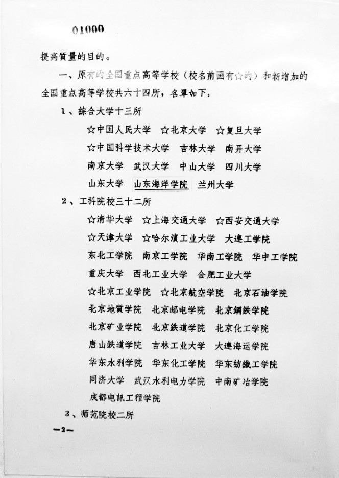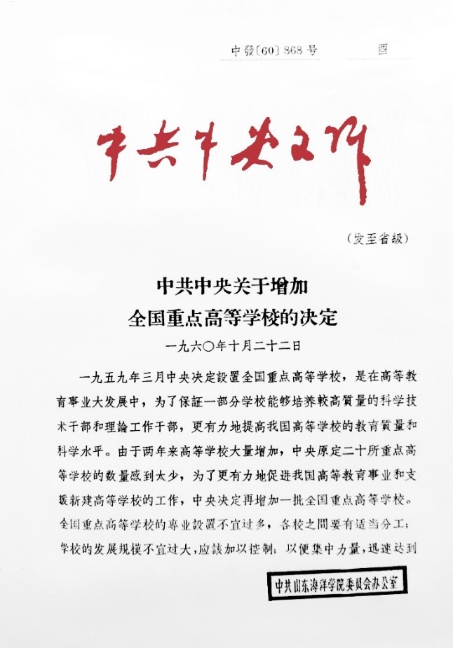 1960年10月,在《中共中央关于增加全国重点高等学校的决定》中,公布了64所全国重点高校,山东海洋学院被列为13所综合大学之一。由此,学校步入特色发展的历史新阶段。