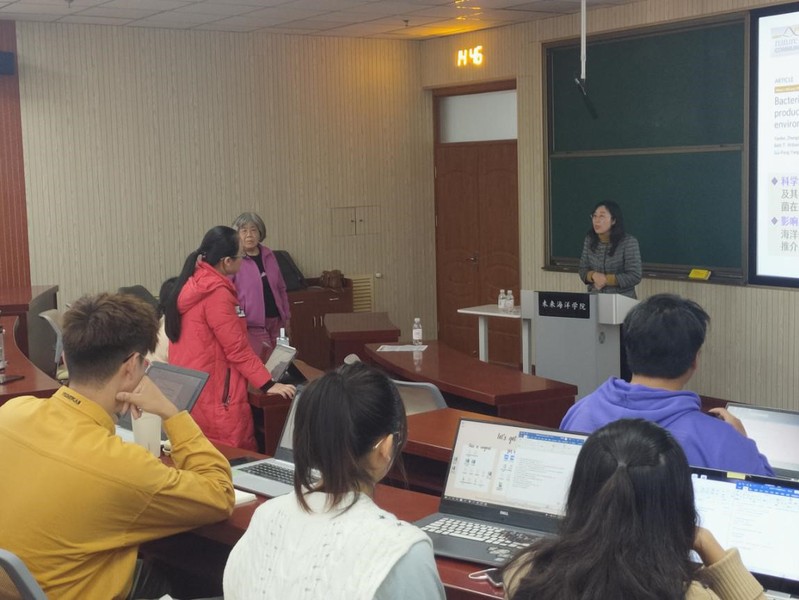 张晓华教授首先用通俗易懂的语言对DMSP和DMS进行了介绍,并指出其生物学作用以及在全球硫循环中的重要作用。随后,她系统地介绍了她和团队如何从发现问题、提出假设开始,经过反复试验、学科交叉合作一步一步验证出异养细菌是深海海水和沉积物中DMSP的重要生产者,并在讲述过程中给同学们普及了相应的生物学知识。