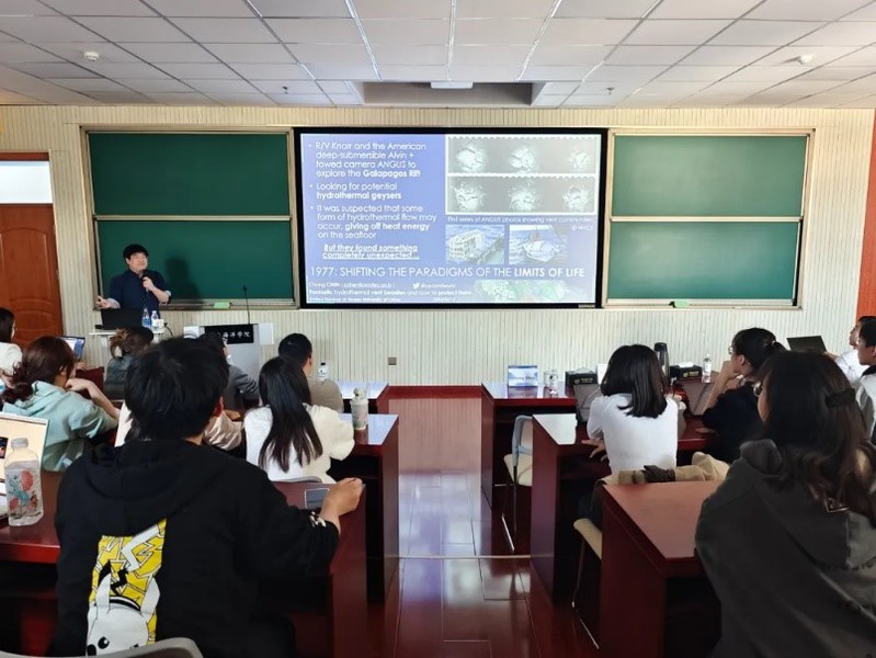 On April 16, at the joint invitation of Prof. Li Jianping, Dean of the Academy of Future Ocean, and Prof. Sun Jin, a Ph.D. supervisor of the Academy of Future Ocean, researcher Chong Chen from Japan Agency for Marine-Earth Science and Technology (JAMSTEC) delivered an academic lecture titled “Fantastic Hydrothermal Vent Beasties and How to Protect Them” at Future Ocean Forum. The lecture was jointly hosted by Prof. Sun Jin, and was attended by over 15,000 participants, including students from the AFO.