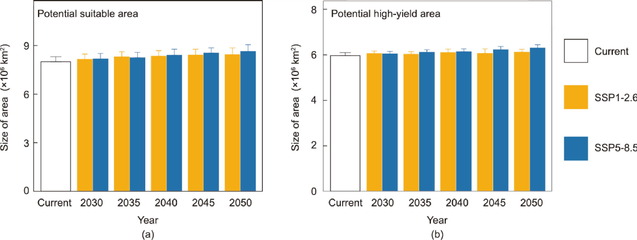 (a)气候变化影响下,全球海水养殖鱼类潜在适宜区的面积;(b)气候变化影响下,全球海水养殖鱼类潜在高产区的面积