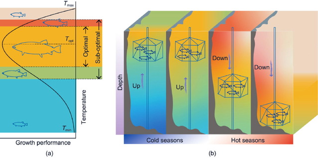 (a)热生长性能曲线;(b) 通过调整网箱深度可以获得适宜的海水养殖环境