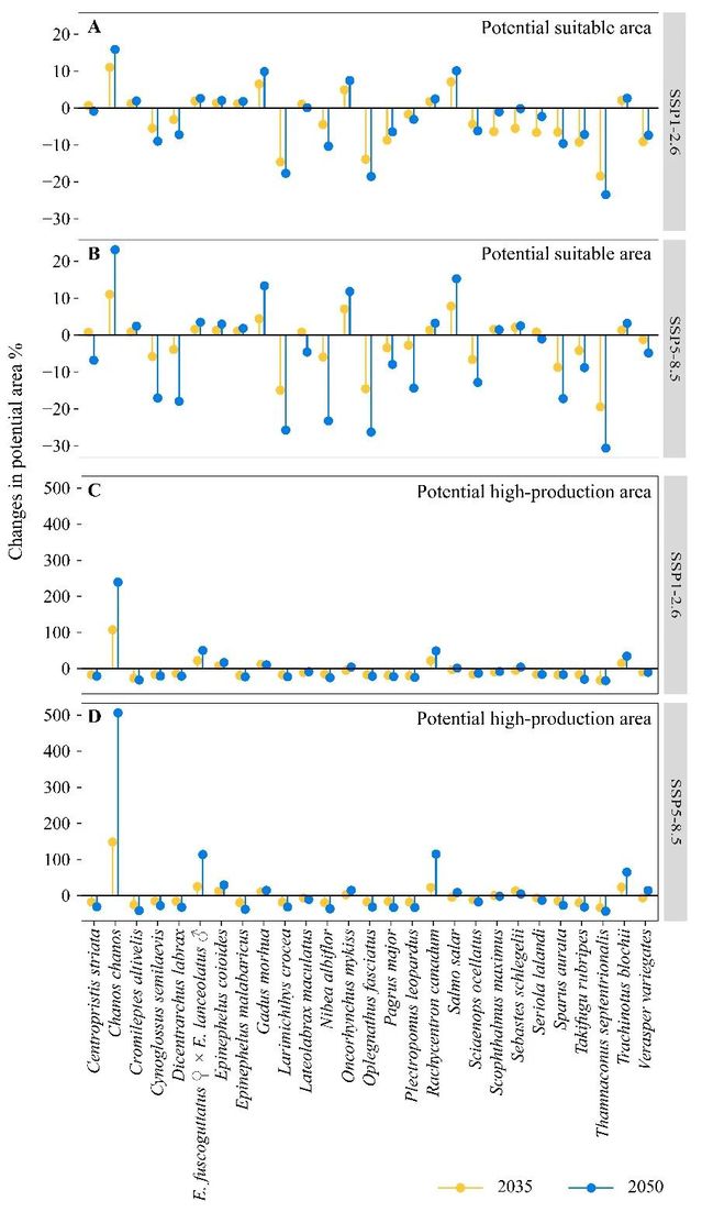 图4. 不同鱼类潜在海水养殖适宜区和高产区对气候变化的响应