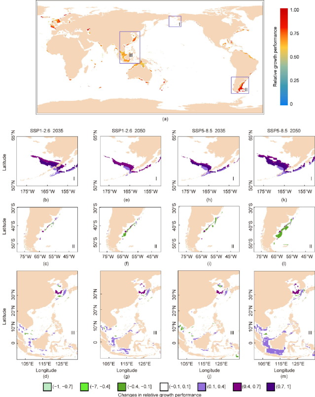 (a)当前条件下海水养殖鱼类的潜在高产区和平均相对生长潜力;(b–m)在气候变化背景下,潜在高产区域内海水养殖物种的平均相对生长潜力的变化