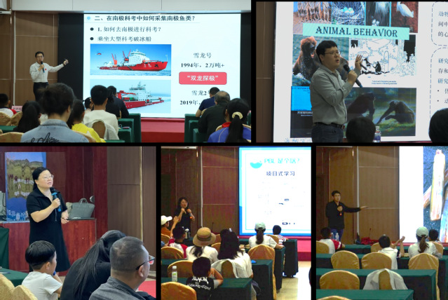 开幕式后,五场精彩的科普讲座依次展开。李建超副教授以《你好,南极鱼类》为题,带领听众走进神秘的南极海域;侯志帅教授在《鱼类性格与行为研究探秘》中,生动解析了鱼类的“个性”与生存智慧;王欣欣副教授通过《“海底建筑师”——人工鱼礁如何构筑海洋牧场生态家园》,展示了人类如何助力海洋生态修复;李慧茹副教授的《走近水生生态系统——PBL项目式学习》以实践案例启发青少年科学思维;胡志博士则在《生物的适应艺术:揭秘潮间带的多样性》中,揭示了潮间带生物的顽强生命力。授课同时,老师们与青少年听众积极互动,不时出传出惊叹声、掌声和笑声。