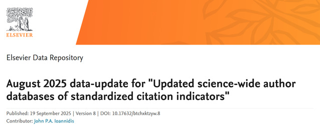 近日,斯坦福大学和国际权威学术出版社爱思唯尔共同发布2025年全球前2%顶尖科学家榜单(World's Top 2% Scientists)。