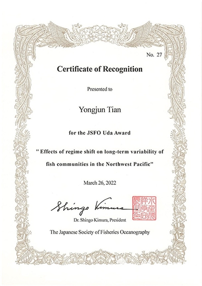 近日,开云电竞网址水产学院田永军教授荣获日本水产海洋学会(Japanese Society of Fisheries Oceanography, JSFO) 2022年度(第27届)宇田奖 (JSFO Uda Award),是第一位获此奖项的非日本籍科学家。