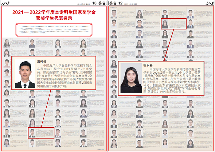 本站讯 5月4日,教育部在人民日报第11—14版发布了2021-2022学年度本专科生国家奖学金获奖学生代表名录和研究生国家奖学金获奖学生代表名录,学校2019级食品科学与工程专业本科生荆树桐、2020级文艺学专业硕士研究生胡永春入选。这是学校自2017-2018学年度以来,连续第五年有优秀学生典型入选名录,第一次有两位同学同时入选名录。