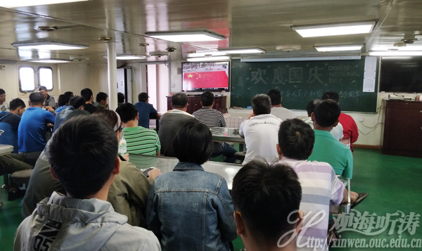 “东方红2”船在船人员集中观看庆祝国庆的电视节目